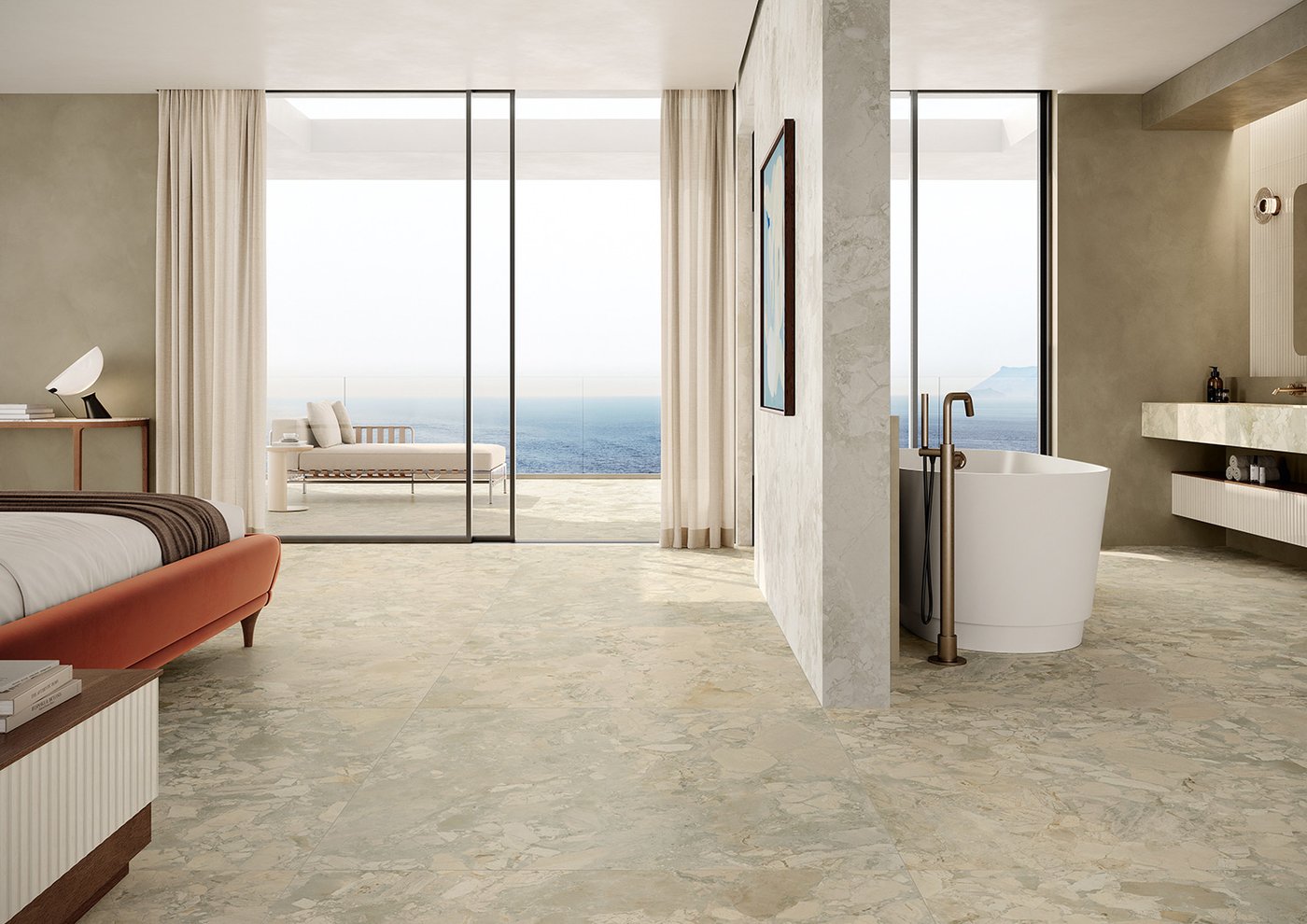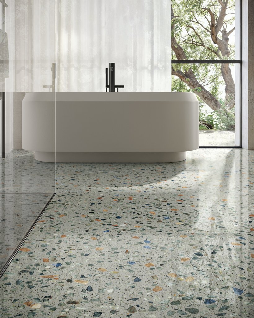 2 / Elixír elegancie. Obklady a dlažby inšpirované tradíciou terrazza so snahou o hodvábnu reinterpretáciu zjemnenú neutrálnymi farbami. Odvážny dizajn s rafinovanými efektami.