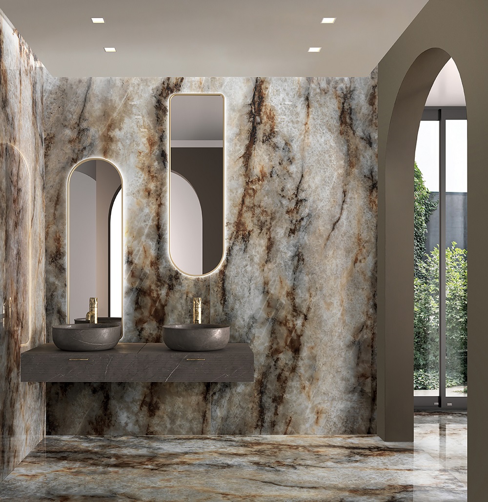 Veľké rozmery obkladov. Rektifikované obklady väčších rozmerov sú ideálnou voľbou pre exkluzívne kúpeľne. Verné imitácie prírodného mramoru a kameňa s dôkladnou pozornosťou na detail spĺňajú náročné požiadavky súčasného dizajnu pre obytné i obchodné priestory.